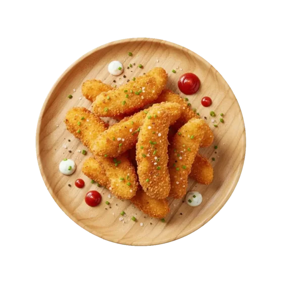 Chicken Fingers: 6 pcs breaded and fries chicken strips.