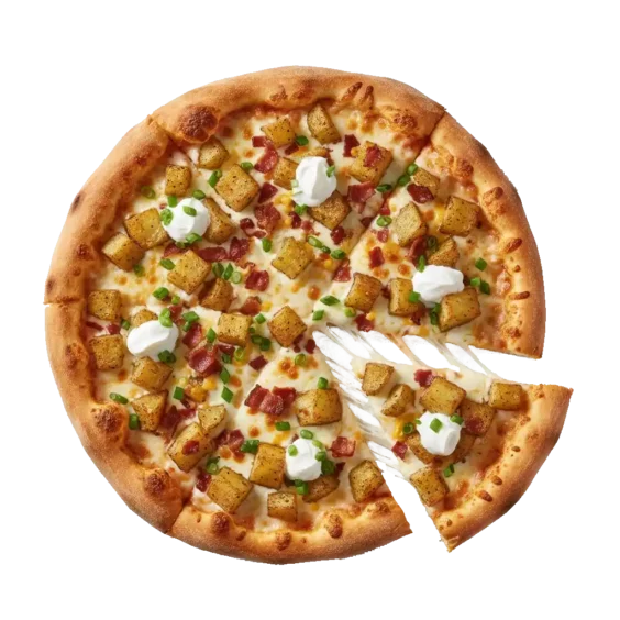 Potato Skin Pizza: Potato skin, bacon, butter garlic sauce