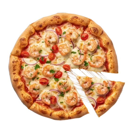 Shrimp Scampi Pizza: Garlic butter sauce, shrimp, tomatoes